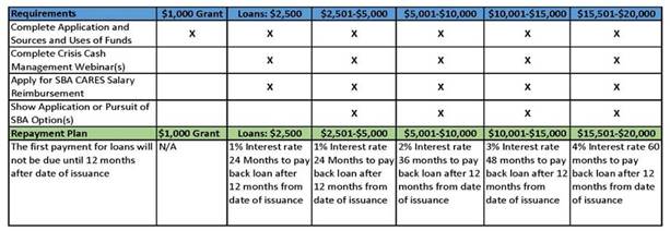 Only complete applications will be accepted. All other grants and loan requests will be reviewed and awarded on first come, first served basis. Refer to the chart below for funding thresholds and terms.