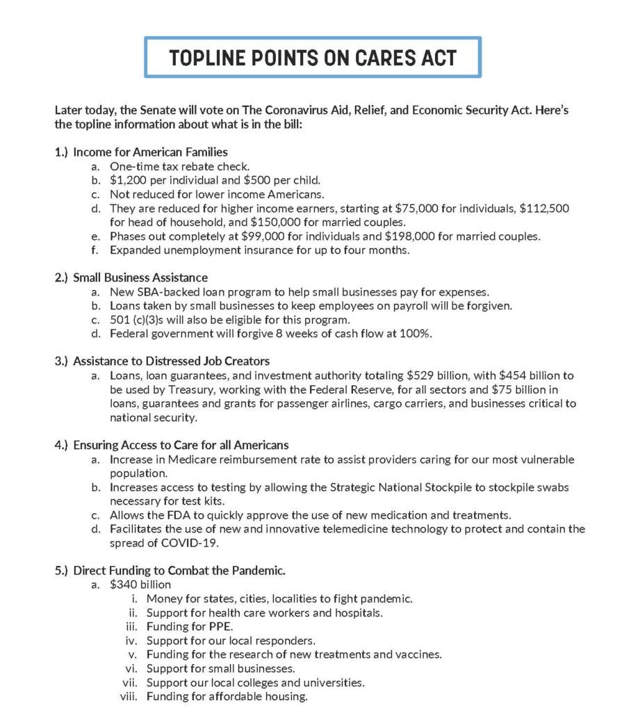 The Senate will be voting on the Coronavirus Aid, Relief, and Economic Security (CARES) Act, the third coronavirus relief package providing emergency aid for American workers, families, small businesses, and hospitals.